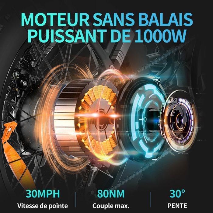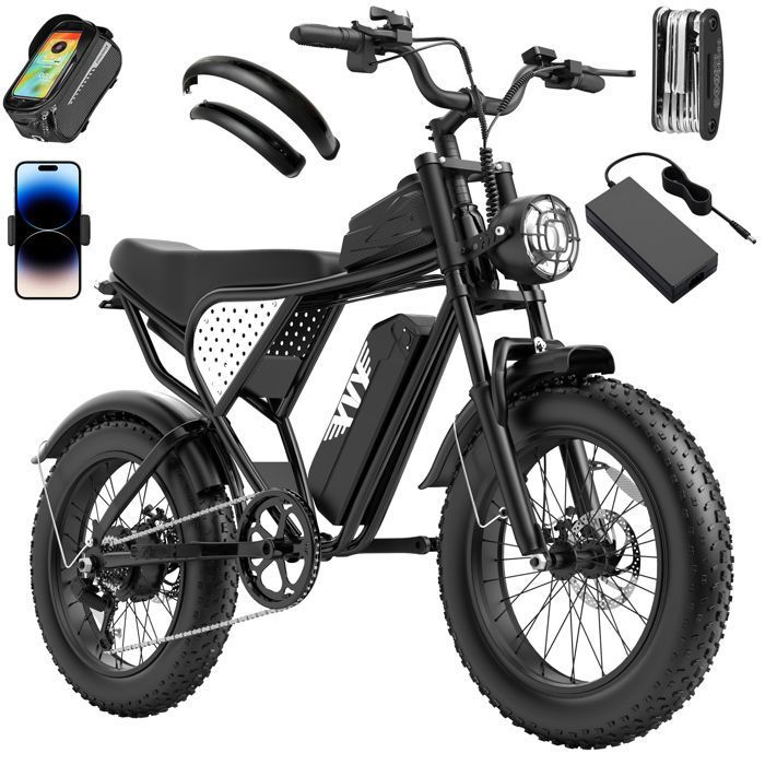 Elektrofahrrad – 20″*4,0-Geländereifen – 1000-W-Motor – abnehmbarer Akku 48 V/15 Ah – Autonomie 50–60 km – Shimano 7 Gänge – Schwarz