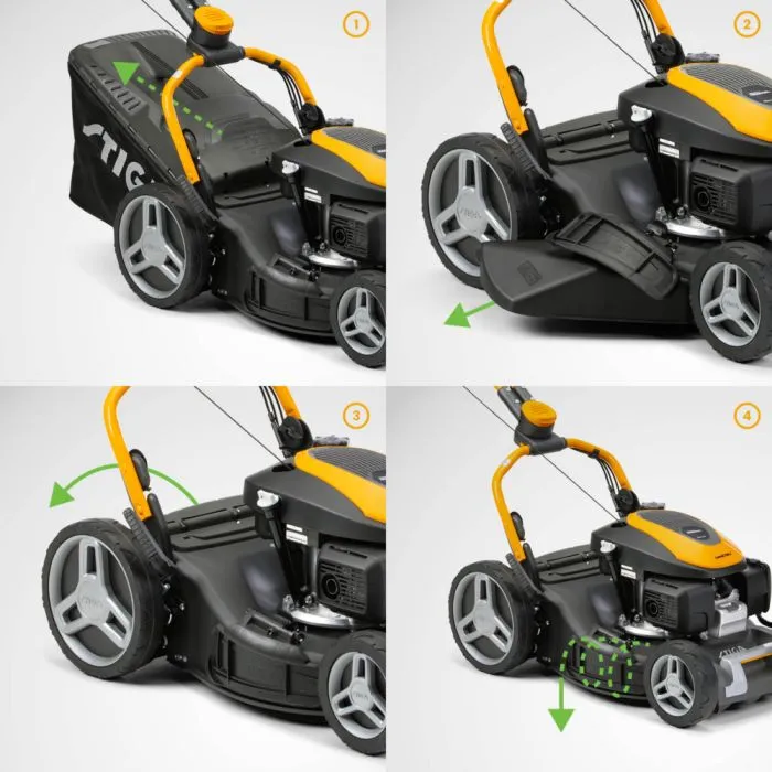 4-in-1 Mähsystem: Fangen, Mulchen, Seitenauswurf, Heckauswurf