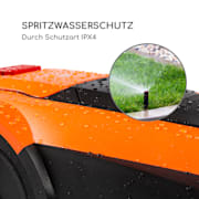 Der Garden Hero ist für den echten Outdoor-Einsatz gebaut. Er ist nach Schutzart IPX4 gegen Spritzwasser geschützt und somit unempfindlich gegenüber Regenschauern. Das Sicherheitspaket umfasst: